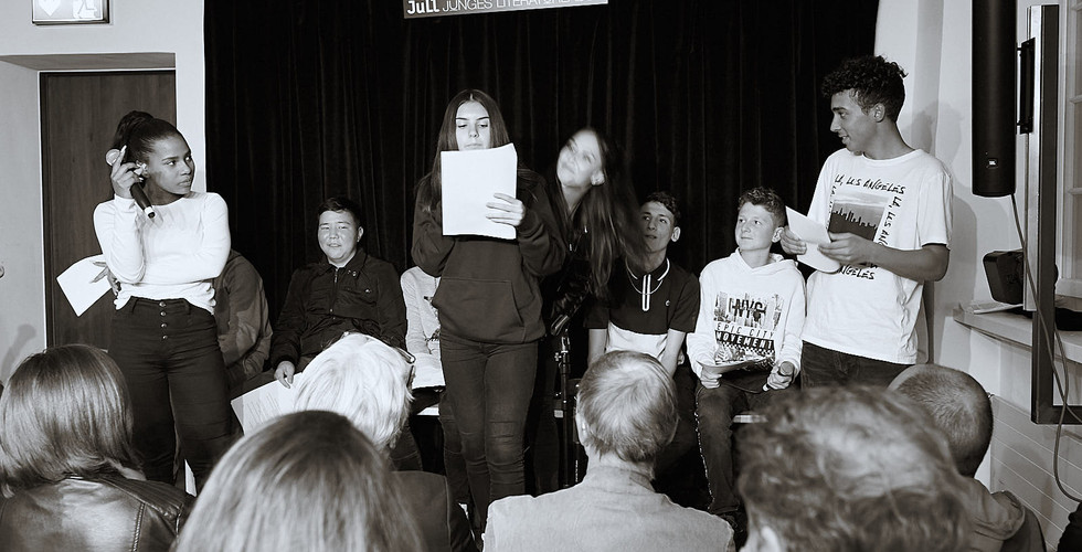 Die beiden Romane sind im Sommerhalbjahr 2019 entstanden. Während einiger Monate kamen die jungen Autor*innen von der Sekundarschule Rieden- halden, Zürich Affoltern, regelmässig zum Schreiben ins Junge Literaturlabor. Gecoacht wurden sie von den Autor*innen Monica Cantieni und Walter Millns. An der Buchvernissage lasen die Jugendlichen der Klasse 3. Sek Feller und der Klasse 3. Sek Heese live on stage aus ihren frischgedruckten Büchern. Fotos: Roland Iselin