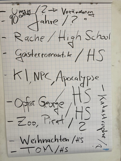 Heute wurde in der Pause Kuchen gegessen. Es wurde im Liegen geschrieben. Es wurde im Liegen über das Geschriebene gesprochen. Dann wurde eine Liste gemacht mit allen Themen, die bis jetzt vorkommen: Rache, 90er, KI, Geister, Pirat, Zoo, Weihnachten, Apocalypse. Jetzt müssen wir die nur noch möglichst elegant, natürlich, unauffällig und poetisch miteinander verknüpfen. Das machen wir dann nächste Woche.