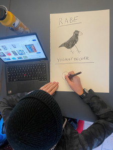 Alle anderen begannen schnell zu schreiben und wir teilten uns wieder in zwei Gruppen auf. Eine Gruppe schrieb oben im grossen Raum mit Lea, die anderen schrieben unten mit Till.